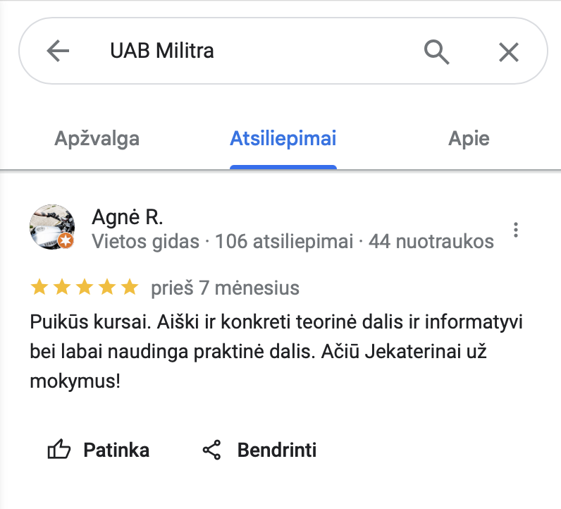 Kursų praktika pranoko visus lūkesčius.Labai patiko ,daug žinių, įdomu klausyt laikas tiesiog prabego norėtusi sedet ir klausytis daug daugiau.Tikros istorijos is gyvenimo geriausi pavyzdžiai.Ačiū mokytojui Andriui.💐